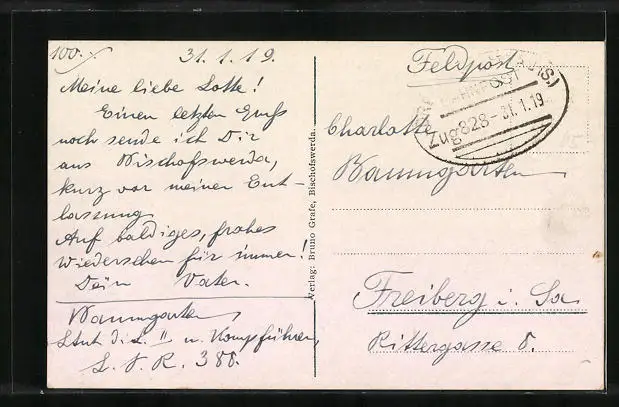 gelaufen 1919 als Feldpost, Oberflächenschaden, guter Zustand
