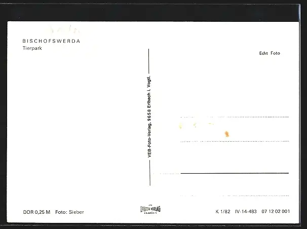 Personenbezogene Daten auf der Rückseite der Karte wurden durch blauen Textmarker unkenntlich gemacht. Die blauen Stellen sind auf die Vorderseite durchgeweicht und wirken sich negativ auf das Postkartenfoto aus