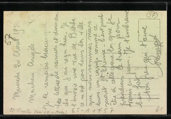 Personenbezogene Daten auf der Rückseite der Karte wurden durch blauen Textmarker unkenntlich gemacht. Die blauen Stellen sind auf die Vorderseite durchgeweicht und wirken sich negativ auf das Postkartenfoto aus