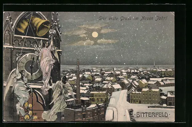 AK Bitterfeld, Blick auf die winterliche Stadt, Engel am Glockenturm