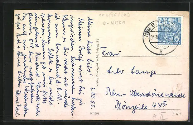 alte Ansichtskarte, gelaufen 1955, Eckknick li. oben, minimaler Einriss li. oben, guter Zustand