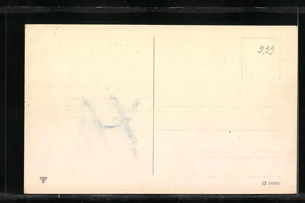 Personenbezogene Daten auf der Rückseite der Karte wurden durch blauen Textmarker unkenntlich gemacht. Die blauen Stellen sind auf die Vorderseite durchgeweicht und wirken sich negativ auf das Postkartenfoto aus