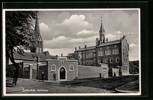 AK Bitterfeld, Rathaus mit Kirche, Strassenansicht