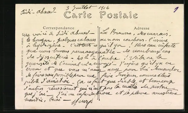 Personenbezogene Daten auf der Rückseite der Karte wurden durch blauen Textmarker unkenntlich gemacht. Die blauen Stellen sind auf die Vorderseite durchgeweicht und wirken sich negativ auf das Postkartenfoto aus