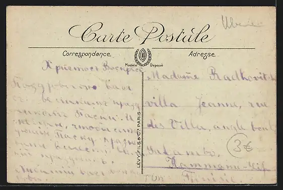 Personenbezogene Daten auf der Rückseite der Karte wurden durch blauen Textmarker unkenntlich gemacht. Die blauen Stellen sind auf die Vorderseite durchgeweicht und wirken sich negativ auf das Postkartenfoto aus