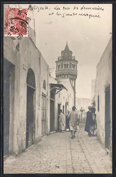 AK Bizerte, Strasse mit Turm und Einwohnern
