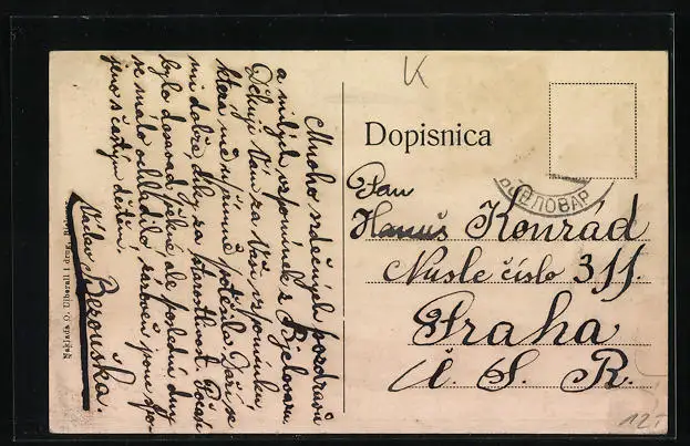 Personenbezogene Daten auf der Rückseite der Karte wurden durch blauen Textmarker unkenntlich gemacht. Die blauen Stellen sind auf die Vorderseite durchgeweicht und wirken sich negativ auf das Postkartenfoto aus
