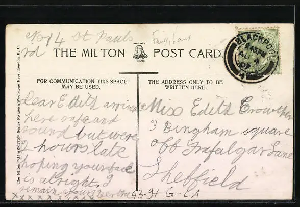 Personenbezogene Daten auf der Rückseite der Karte wurden durch blauen Textmarker unkenntlich gemacht. Die blauen Stellen sind auf die Vorderseite durchgeweicht und wirken sich negativ auf das Postkartenfoto aus