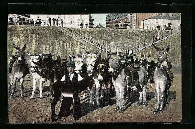 AK Blackpool Sands, Gesattelte und bepackte Esel in einer Arena, Besitzer mit Fohlen