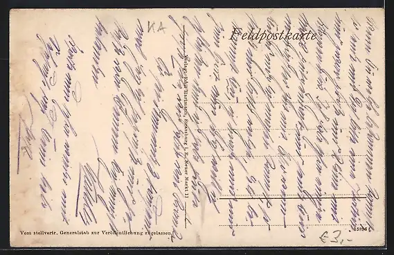Personenbezogene Daten auf der Rückseite der Karte wurden durch blauen Textmarker unkenntlich gemacht. Die blauen Stellen sind auf die Vorderseite durchgeweicht und wirken sich negativ auf das Postkartenfoto aus