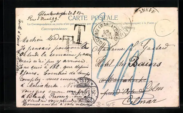 Personenbezogene Daten auf der Rückseite der Karte wurden durch blauen Textmarker unkenntlich gemacht. Die blauen Stellen sind auf die Vorderseite durchgeweicht und wirken sich negativ auf das Postkartenfoto aus