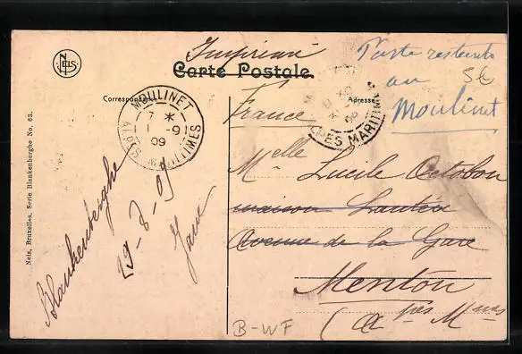 Personenbezogene Daten auf der Rückseite der Karte wurden durch blauen Textmarker unkenntlich gemacht. Die blauen Stellen sind auf die Vorderseite durchgeweicht und wirken sich negativ auf das Postkartenfoto aus