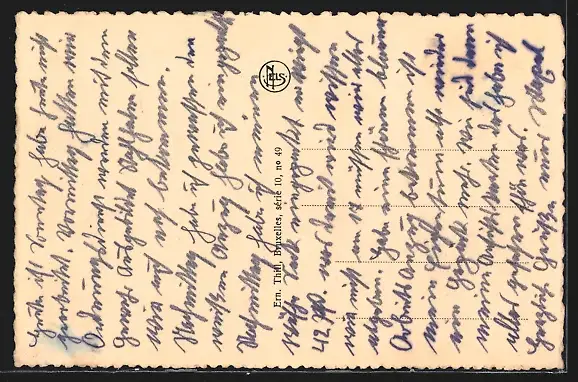 Personenbezogene Daten auf der Rückseite der Karte wurden durch blauen Textmarker unkenntlich gemacht. Die blauen Stellen sind auf die Vorderseite durchgeweicht und wirken sich negativ auf das Postkartenfoto aus