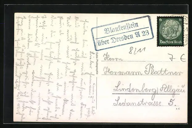 Personenbezogene Daten auf der Rückseite der Karte wurden durch blauen Textmarker unkenntlich gemacht. Die blauen Stellen sind auf die Vorderseite durchgeweicht und wirken sich negativ auf das Postkartenfoto aus