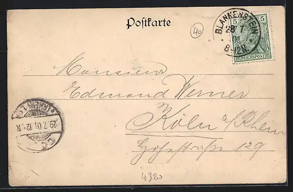 Personenbezogene Daten auf der Rückseite der Karte wurden durch blauen Textmarker unkenntlich gemacht. Die blauen Stellen sind auf die Vorderseite durchgeweicht und wirken sich negativ auf das Postkartenfoto aus