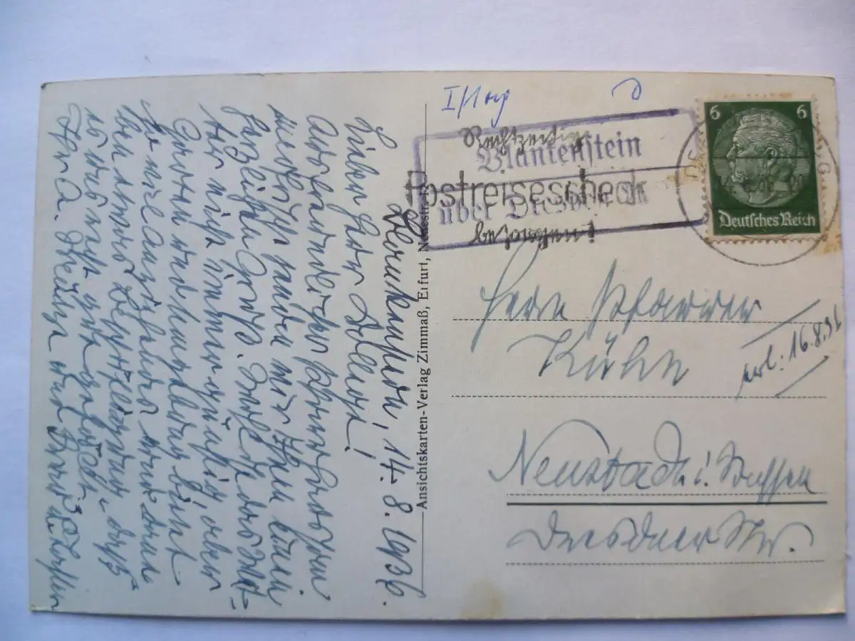 Ansichtskarten-Verlag Zimmaß, Erfurt. Gelaufen 1938 mit Landpoststempel Blankenstein über Dresden. Gut erhalten.