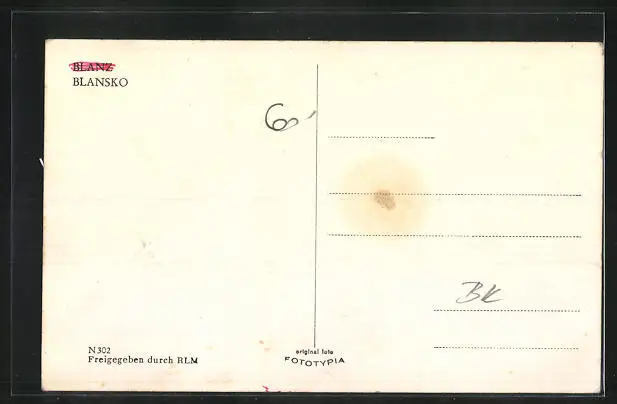 Personenbezogene Daten auf der Rückseite der Karte wurden durch blauen Textmarker unkenntlich gemacht. Die blauen Stellen sind auf die Vorderseite durchgeweicht und wirken sich negativ auf das Postkartenfoto aus