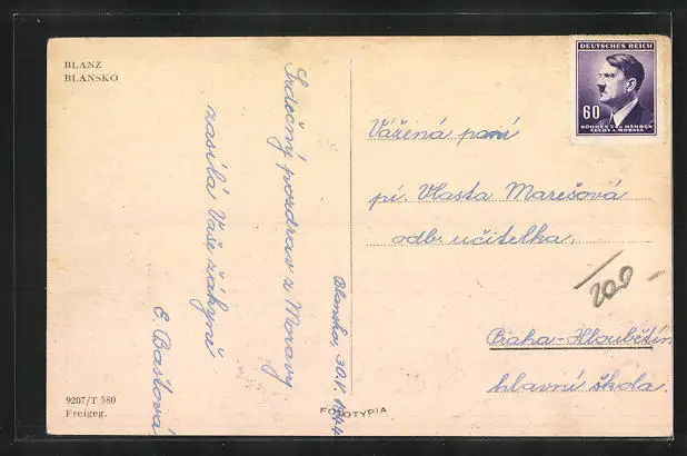 Personenbezogene Daten auf der Rückseite der Karte wurden durch blauen Textmarker unkenntlich gemacht. Die blauen Stellen sind auf die Vorderseite durchgeweicht und wirken sich negativ auf das Postkartenfoto aus