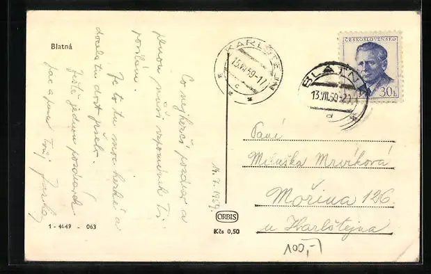 Personenbezogene Daten auf der Rückseite der Karte wurden durch blauen Textmarker unkenntlich gemacht. Die blauen Stellen sind auf die Vorderseite durchgeweicht und wirken sich negativ auf das Postkartenfoto aus
