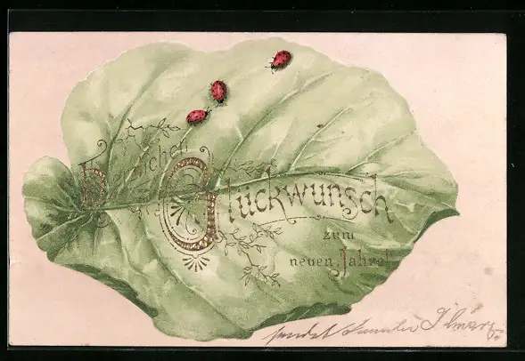 AK Blatt mit Marienkäfern zu Neujahr