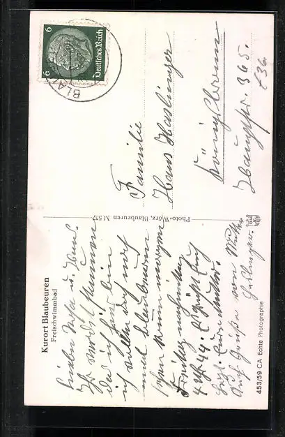 Personenbezogene Daten auf der Rückseite der Karte wurden durch blauen Textmarker unkenntlich gemacht. Die blauen Stellen sind auf die Vorderseite durchgeweicht und wirken sich negativ auf das Postkartenfoto aus