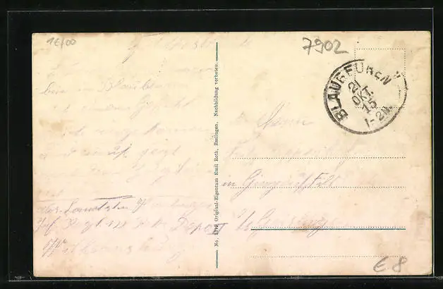 Personenbezogene Daten auf der Rückseite der Karte wurden durch blauen Textmarker unkenntlich gemacht. Die blauen Stellen sind auf die Vorderseite durchgeweicht und wirken sich negativ auf das Postkartenfoto aus