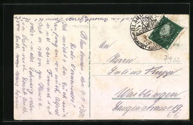 Personenbezogene Daten auf der Rückseite der Karte wurden durch blauen Textmarker unkenntlich gemacht. Die blauen Stellen sind auf die Vorderseite durchgeweicht und wirken sich negativ auf das Postkartenfoto aus