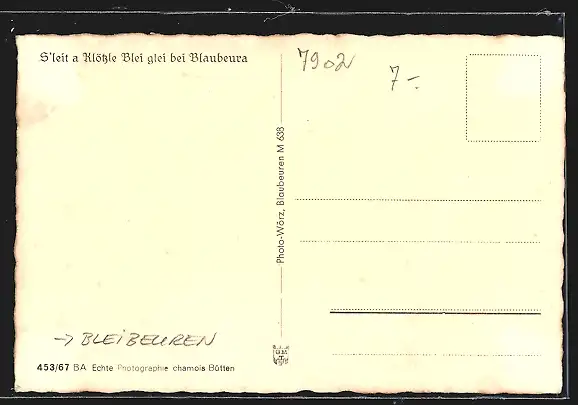 Personenbezogene Daten auf der Rückseite der Karte wurden durch blauen Textmarker unkenntlich gemacht. Die blauen Stellen sind auf die Vorderseite durchgeweicht und wirken sich negativ auf das Postkartenfoto aus