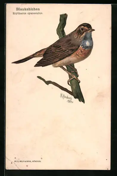 AK Blaukehlchen sitzt auf einem Zweig, Erythacus cyaneculus