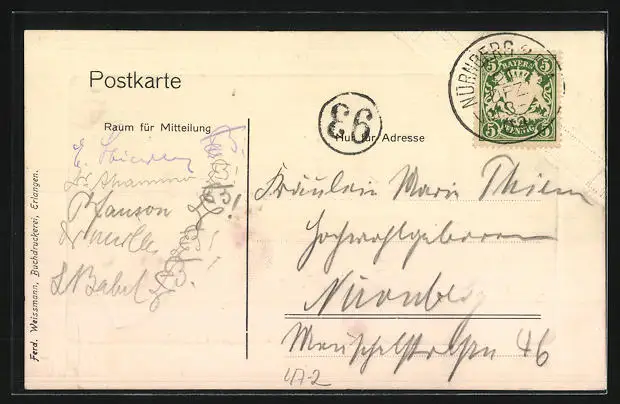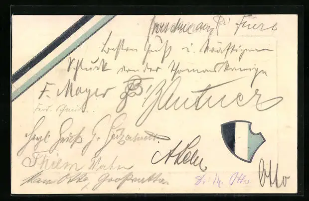 Personenbezogene Daten auf der Rückseite der Karte wurden durch blauen Textmarker unkenntlich gemacht. Die blauen Stellen sind auf die Vorderseite durchgeweicht und wirken sich negativ auf das Postkartenfoto aus