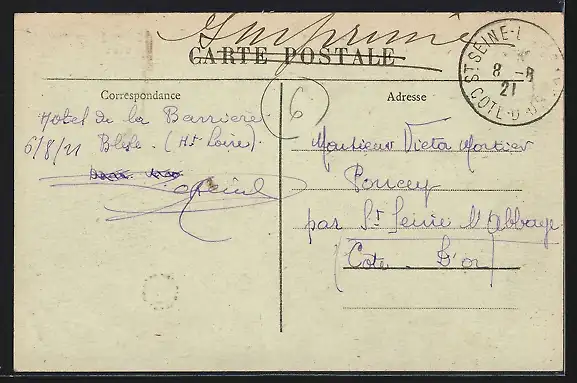Personenbezogene Daten auf der Rückseite der Karte wurden durch blauen Textmarker unkenntlich gemacht. Die blauen Stellen sind auf die Vorderseite durchgeweicht und wirken sich negativ auf das Postkartenfoto aus