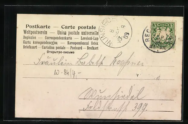 Personenbezogene Daten auf der Rückseite der Karte wurden durch blauen Textmarker unkenntlich gemacht. Die blauen Stellen sind auf die Vorderseite durchgeweicht und wirken sich negativ auf das Postkartenfoto aus