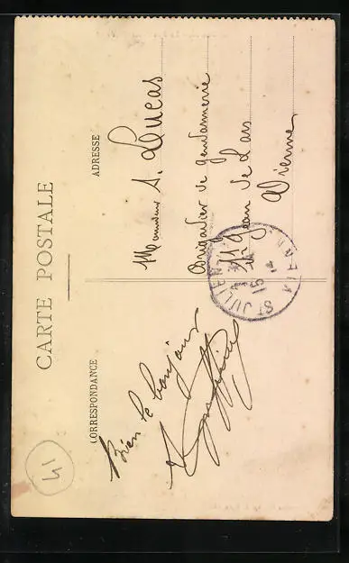 Personenbezogene Daten auf der Rückseite der Karte wurden durch blauen Textmarker unkenntlich gemacht. Die blauen Stellen sind auf die Vorderseite durchgeweicht und wirken sich negativ auf das Postkartenfoto aus