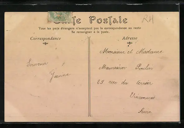 Personenbezogene Daten auf der Rückseite der Karte wurden durch blauen Textmarker unkenntlich gemacht. Die blauen Stellen sind auf die Vorderseite durchgeweicht und wirken sich negativ auf das Postkartenfoto aus