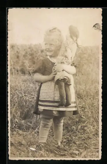 AK Blondes Mädchen ganz glücklich mit ihrer Puppe im Arm