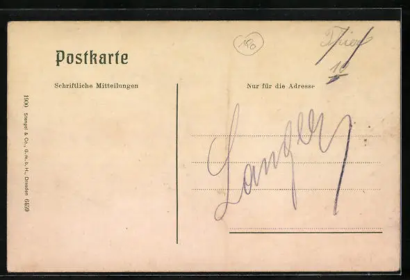 Personenbezogene Daten auf der Rückseite der Karte wurden durch blauen Textmarker unkenntlich gemacht. Die blauen Stellen sind auf die Vorderseite durchgeweicht und wirken sich negativ auf das Postkartenfoto aus