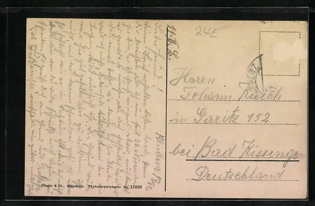 Personenbezogene Daten auf der Rückseite der Karte wurden durch blauen Textmarker unkenntlich gemacht. Die blauen Stellen sind auf die Vorderseite durchgeweicht und wirken sich negativ auf das Postkartenfoto aus