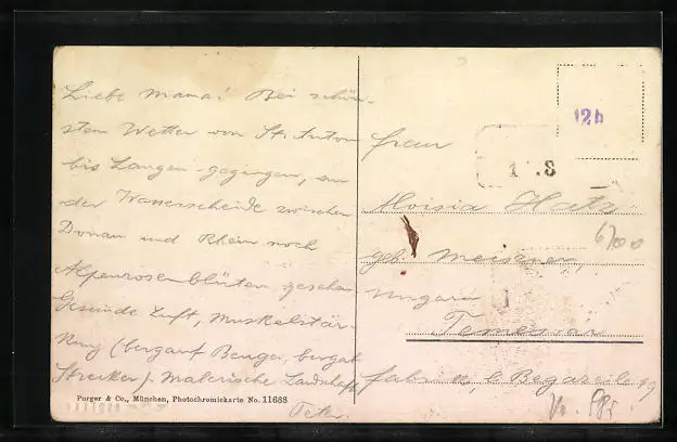 Personenbezogene Daten auf der Rückseite der Karte wurden durch blauen Textmarker unkenntlich gemacht. Die blauen Stellen sind auf die Vorderseite durchgeweicht und wirken sich negativ auf das Postkartenfoto aus
