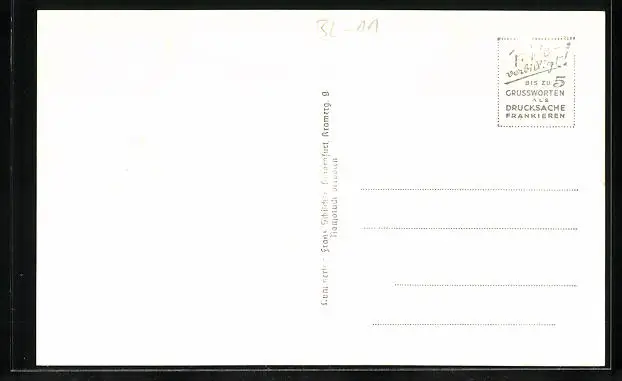 Personenbezogene Daten auf der Rückseite der Karte wurden durch blauen Textmarker unkenntlich gemacht. Die blauen Stellen sind auf die Vorderseite durchgeweicht und wirken sich negativ auf das Postkartenfoto aus