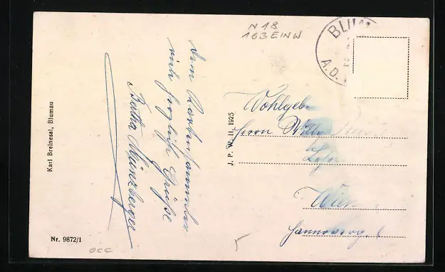 Personenbezogene Daten auf der Rückseite der Karte wurden durch blauen Textmarker unkenntlich gemacht. Die blauen Stellen sind auf die Vorderseite durchgeweicht und wirken sich negativ auf das Postkartenfoto aus