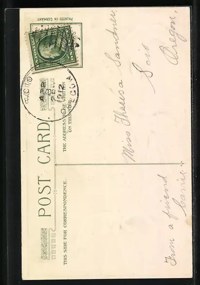 Personenbezogene Daten auf der Rückseite der Karte wurden durch blauen Textmarker unkenntlich gemacht. Die blauen Stellen sind auf die Vorderseite durchgeweicht und wirken sich negativ auf das Postkartenfoto aus
