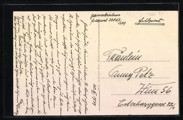 Personenbezogene Daten auf der Rückseite der Karte wurden durch blauen Textmarker unkenntlich gemacht. Die blauen Stellen sind auf die Vorderseite durchgeweicht und wirken sich negativ auf das Postkartenfoto aus