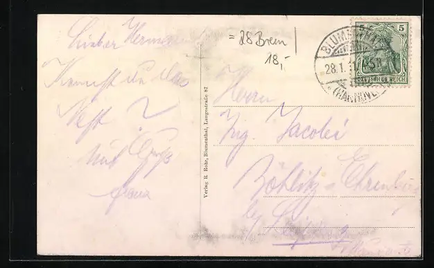 Personenbezogene Daten auf der Rückseite der Karte wurden durch blauen Textmarker unkenntlich gemacht. Die blauen Stellen sind auf die Vorderseite durchgeweicht und wirken sich negativ auf das Postkartenfoto aus