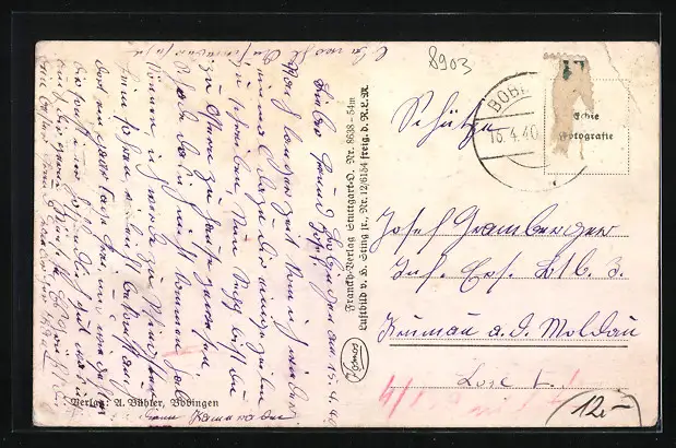 Personenbezogene Daten auf der Rückseite der Karte wurden durch blauen Textmarker unkenntlich gemacht. Die blauen Stellen sind auf die Vorderseite durchgeweicht und wirken sich negativ auf das Postkartenfoto aus