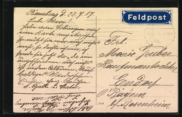 Personenbezogene Daten auf der Rückseite der Karte wurden durch blauen Textmarker unkenntlich gemacht. Die blauen Stellen sind auf die Vorderseite durchgeweicht und wirken sich negativ auf das Postkartenfoto aus