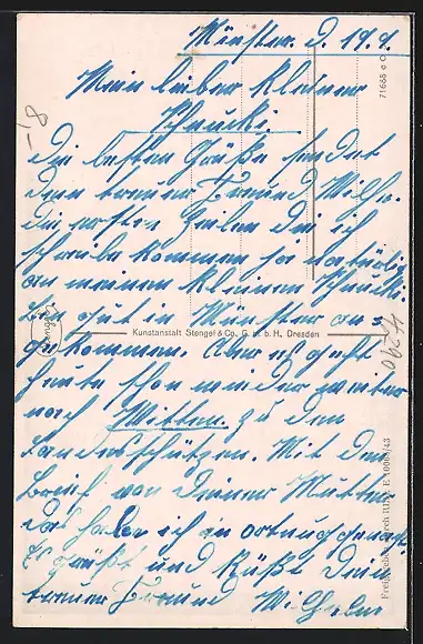 Personenbezogene Daten auf der Rückseite der Karte wurden durch blauen Textmarker unkenntlich gemacht. Die blauen Stellen sind auf die Vorderseite durchgeweicht und wirken sich negativ auf das Postkartenfoto aus