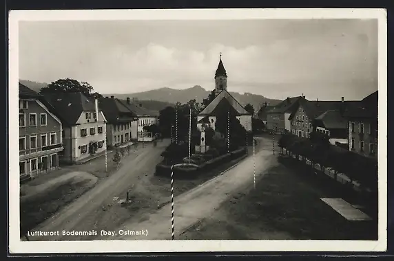 AK Bodenmais / Bay. Ostmark, Strassenpartie mit Kirchturm