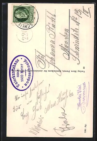 Personenbezogene Daten auf der Rückseite der Karte wurden durch blauen Textmarker unkenntlich gemacht. Die blauen Stellen sind auf die Vorderseite durchgeweicht und wirken sich negativ auf das Postkartenfoto aus