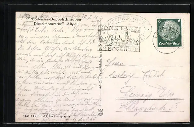Personenbezogene Daten auf der Rückseite der Karte wurden durch blauen Textmarker unkenntlich gemacht. Die blauen Stellen sind auf die Vorderseite durchgeweicht und wirken sich negativ auf das Postkartenfoto aus