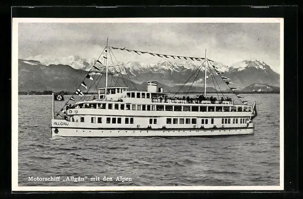 AK Bodensee, Motorschiff Allgäu in Flaggengala mit den Alpen